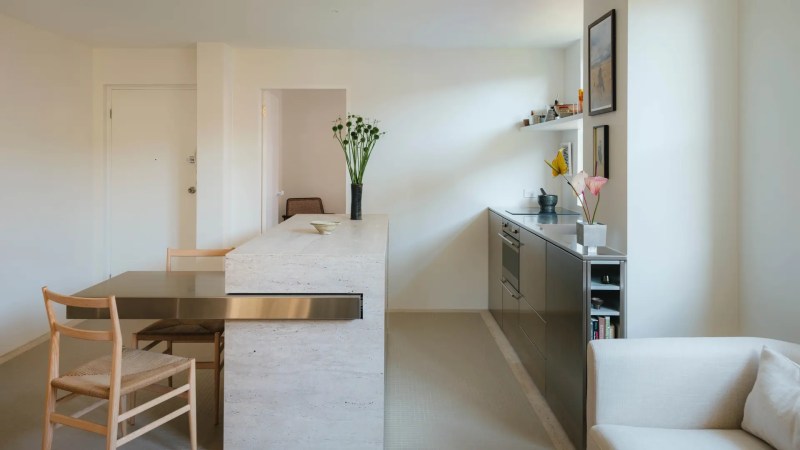 Des caractéristiques astucieuses telles qu’une table à manger en acier inoxydable articulée en porte-à-faux sur le banc de l’îlot maximisent l’espace pour favoriser une existence plus spacieuse et plus calme.