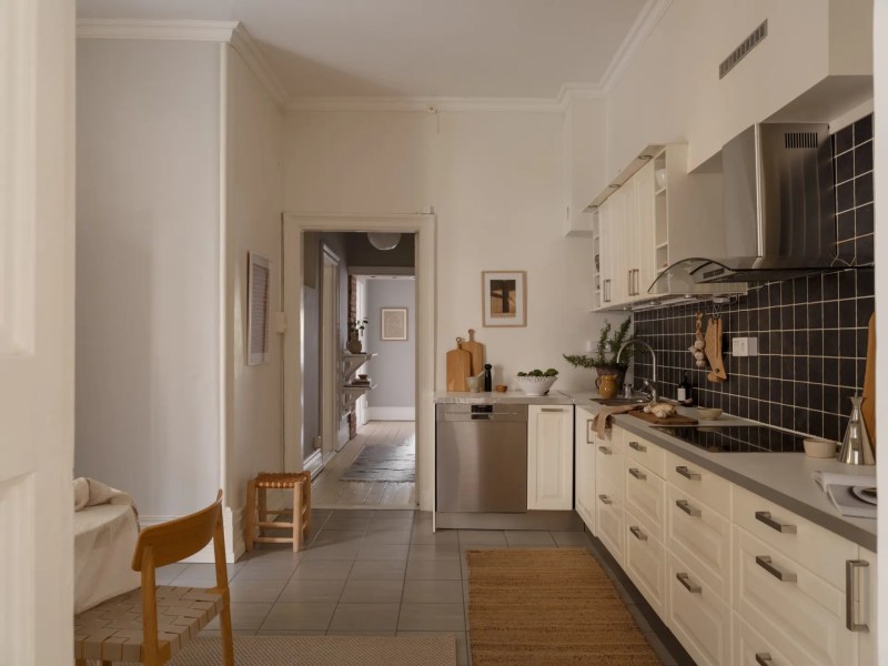 Cuisine spacieuse et bien agencée avec un grand plan de travail et suffisamment d’espace pour une table à manger. Depuis la cuisine, on accède au balcon de la maison, situé à l’abri et donnant sur la cour. Ce balcon fait office de petite terrasse, un endroit idéal pour prendre son café du matin ou dîner le soir.