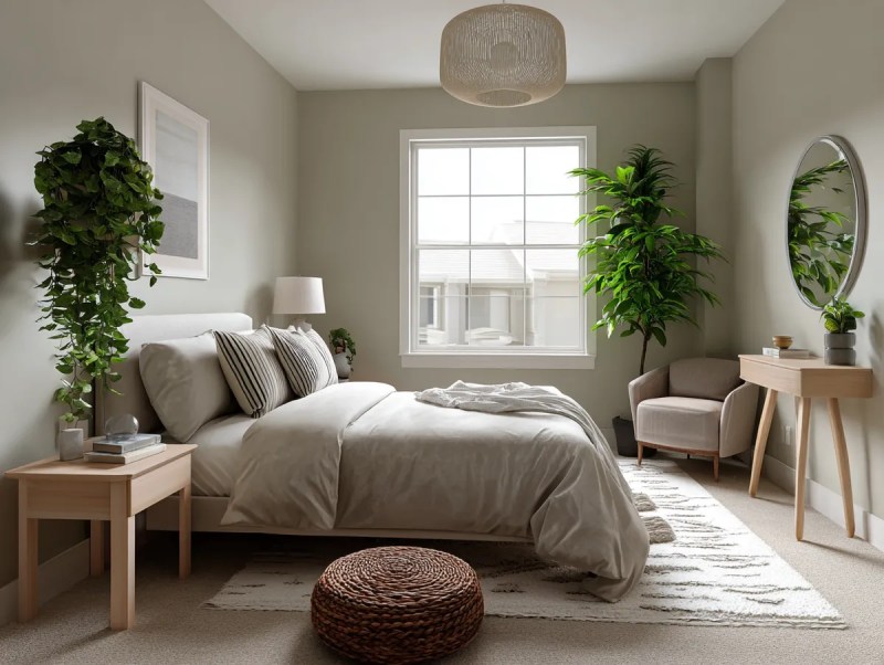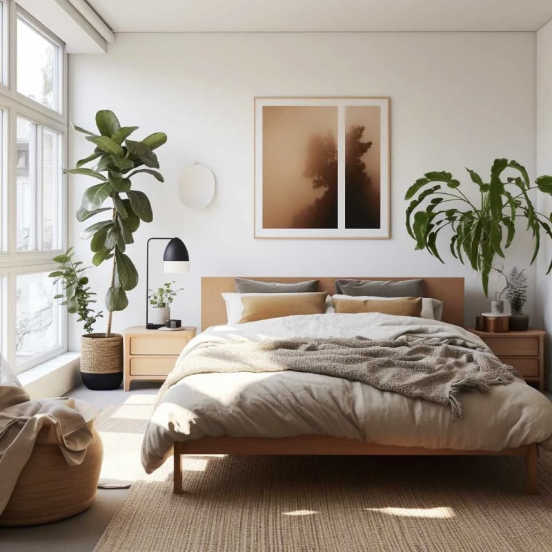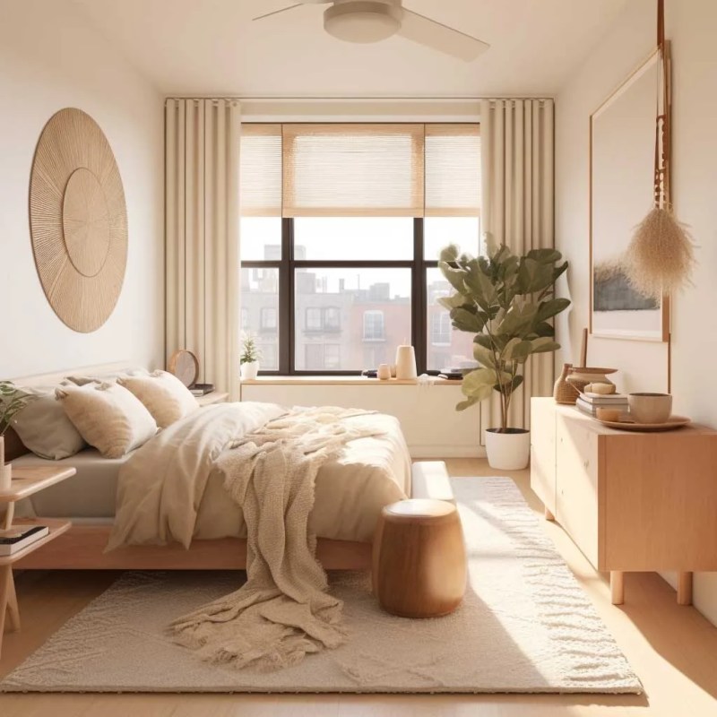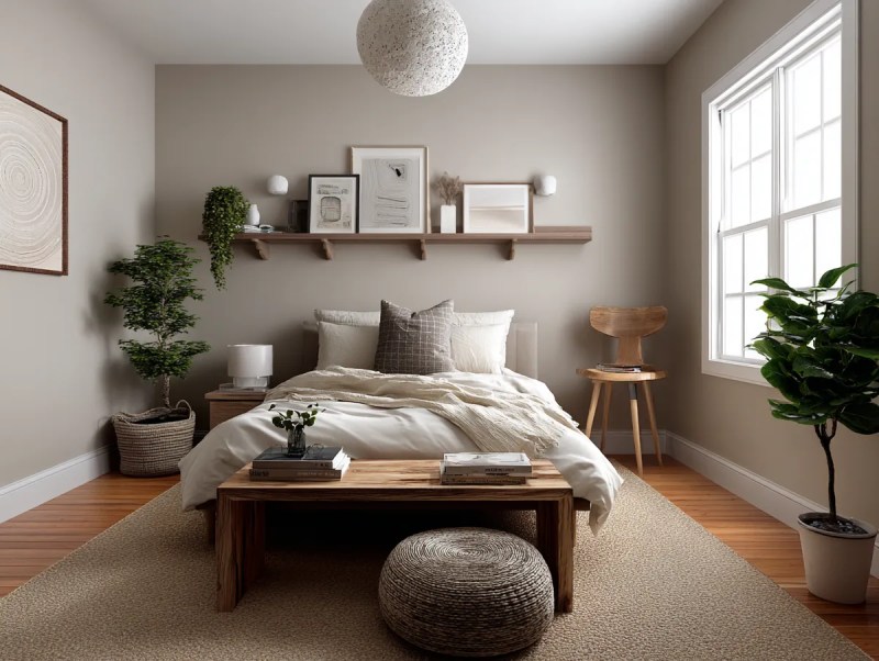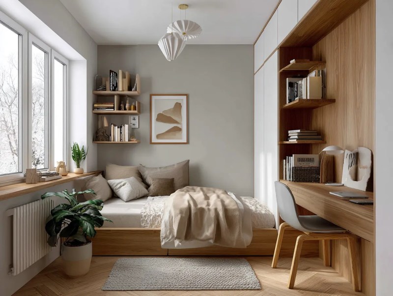 L’image capture l’ambiance sereine d’une petite chambre de style Japandi. Cette philosophie de design, qui allie la simplicité japonaise à la fonctionnalité scandinave, crée une oasis de calme et d’espace, idéale pour le repos et la détente.