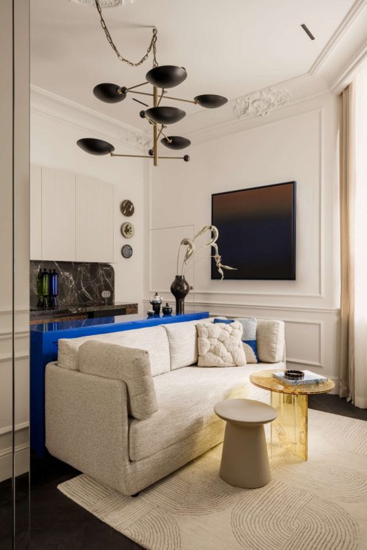 Piotr Lucyan a créé à Łódź en Pologne un second chez-soi qui se dévoile par petites touches. Cet appartement de seulement 34 mètres carrés séduit par sa lumière sculpturale, ses matériaux nobles et quelques astuces audacieuses. La plus grande surprise se cache à la vue de tous : un écrin à bijoux en miroir trône au cœur du salon, dissimulant une salle de bain complète, un dressing, un placard et un lave-linge, tandis que ses reflets doublent subtilement la sensation d’espace.