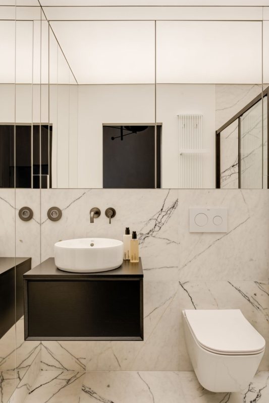 Une fois à l’intérieur de la salle de bains , l’illusion se poursuit. Le marbre blanc Calacatta Lilac, les grands panneaux de miroirs et le plafond tendu rétroéclairé créent l’impression d’une verrière et d’une pièce qui s’ouvre sur le ciel.