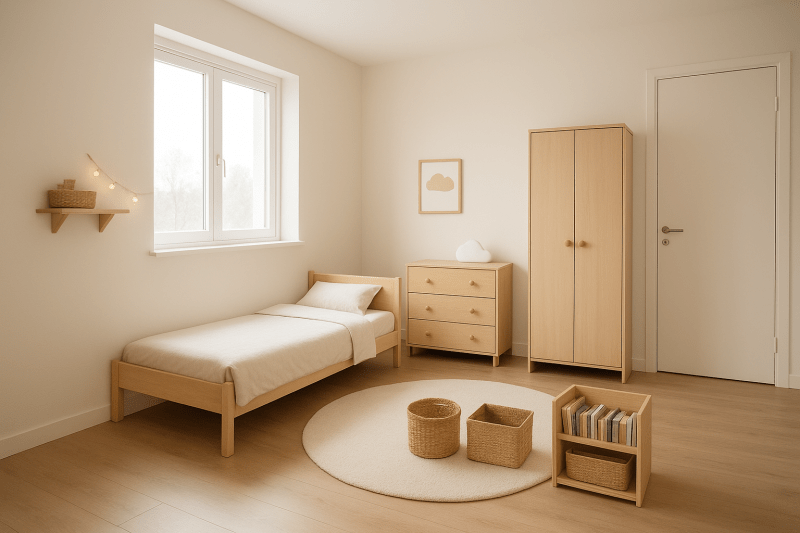 ✔ Ajoute 2–3 bacs de rangement bas (rotin, tissu…).