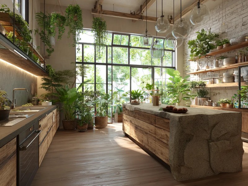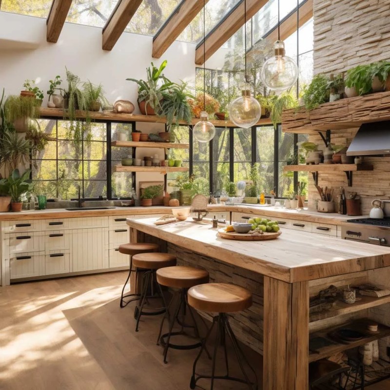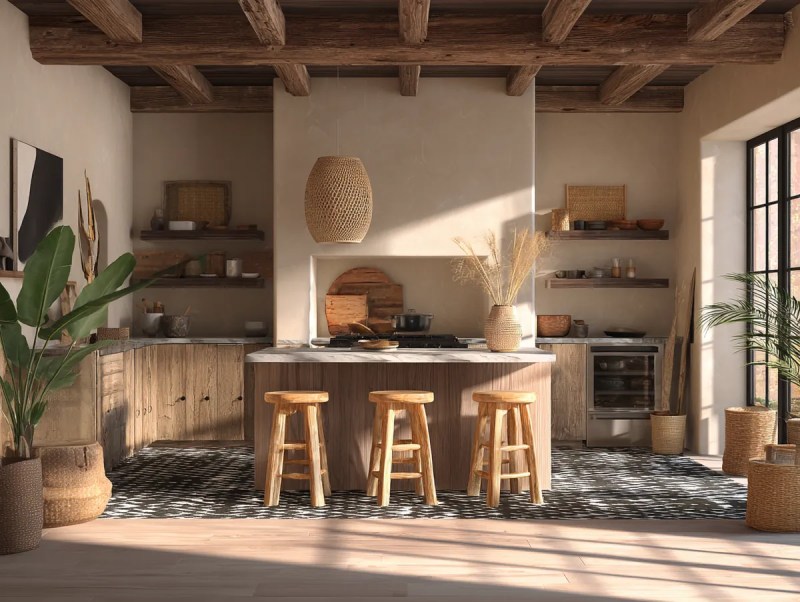 Le choix des meubles de cuisine est primordial dans une cuisine bohème moderne. Les meubles en bois, teintés dans des tons bruns profonds ou laissés au naturel, dégagent un charme rustique. Associés à des accessoires et des ferrures modernes, ils créent un mélange harmonieux d’ancien et de moderne.