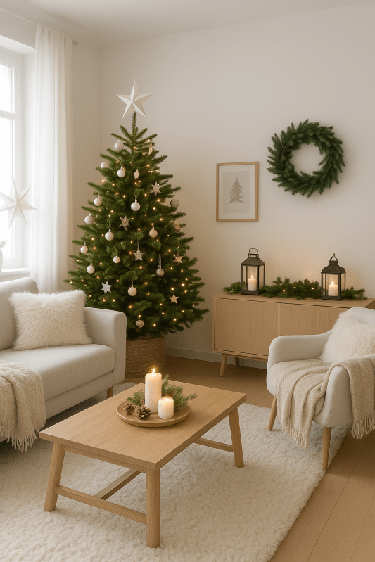 Pour un salon de couleur claire (blanc, beige, crème, gris très doux), l’ambiance scandinave de Noël ressort magnifiquement. Voici un plan de déco complet, simple et élégant ✨🌲