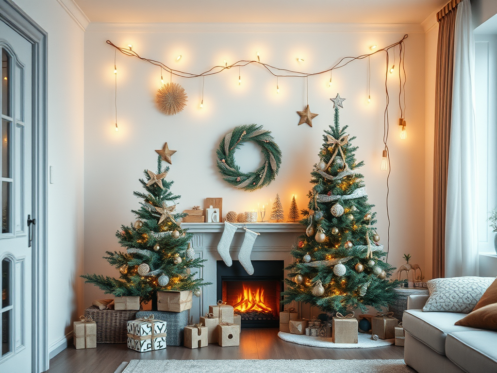 • Sur les murs : cadres minimalistes (étoiles, paysages enneigés, texte “NOEL” stylé)