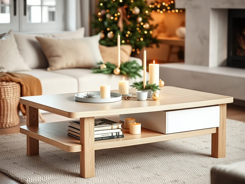 • Sur la table basse : plateau en bois + bougie + mini sapin