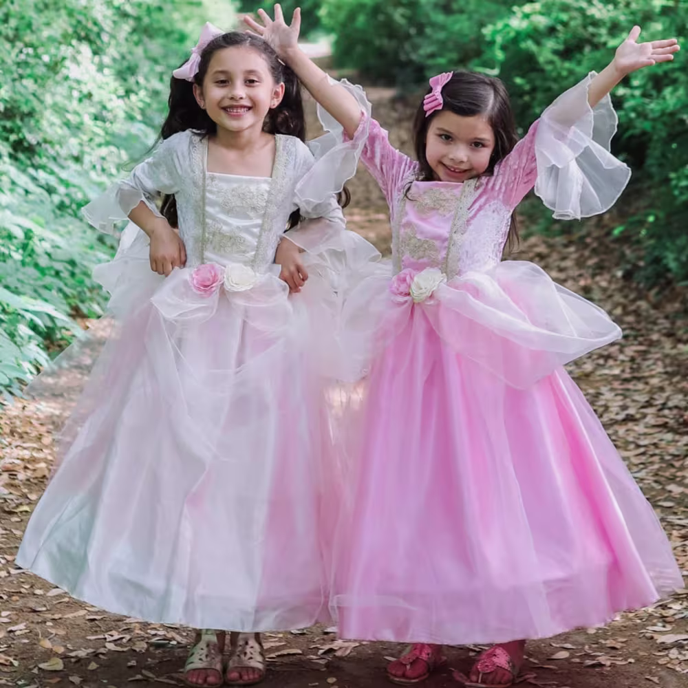 Transformez votre enfant en véritable princesse avec cette magnifique robe rose et or de Great Pretenders. Confortable grâce à son velours extensible et majestueuse avec sa jupe à cerceau
