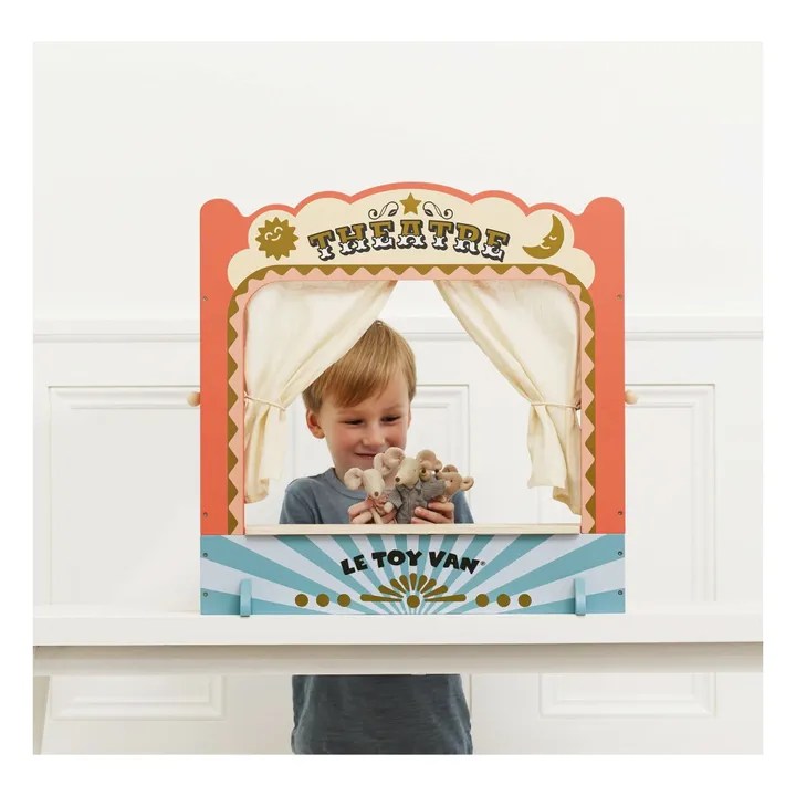 Le théâtre de marionnettes signé Le Toy Van séduit par ses teintes corail et sa structure en bois massif. Il invite les enfants à imaginer, raconter et mettre en scène leurs histoires. Une fois le spectacle terminé, il devient un élément décoratif plein de charme, parfait dans un coin lecture ou une salle de jeux. Un jouet qui stimule la créativité et ajoute une touche rétro à la déco.
