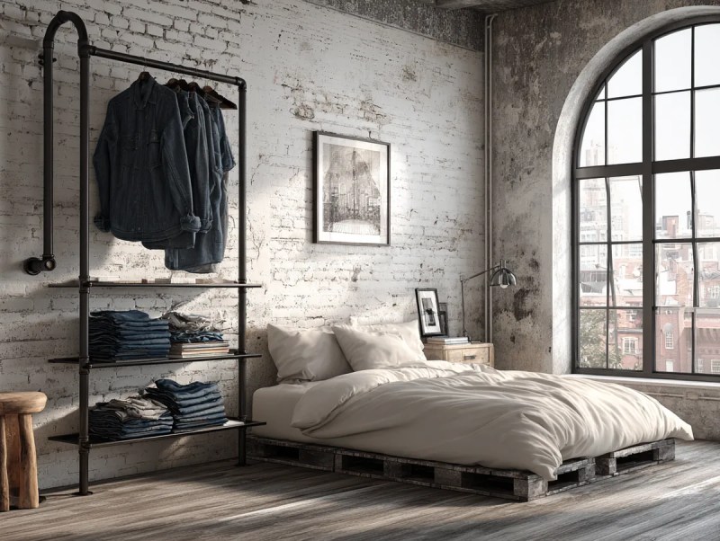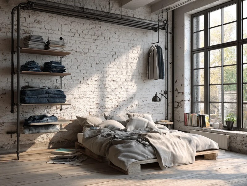 Dans une petite chambre, une tête de lit imposante peut paraître encombrante. En revanche, une tête de lit en planches de bois brut horizontales peut agrandir visuellement l’espace. Les lignes horizontales guident le regard et donnent une impression de largeur. Un lit plateforme en bois de palette ou en bois vieilli permet de conserver un profil bas, ce qui augmente la hauteur sous plafond perçue – une astuce essentielle pour décorer une petite chambre. Le bois ne doit pas être immaculé ni trop poli ; le style industriel s’épanouit dans un aspect patiné. Cette imperfection masque les marques du temps, ce qui en fait un choix pratique pour les petits espaces où l’on a tendance à se cogner contre les meubles.