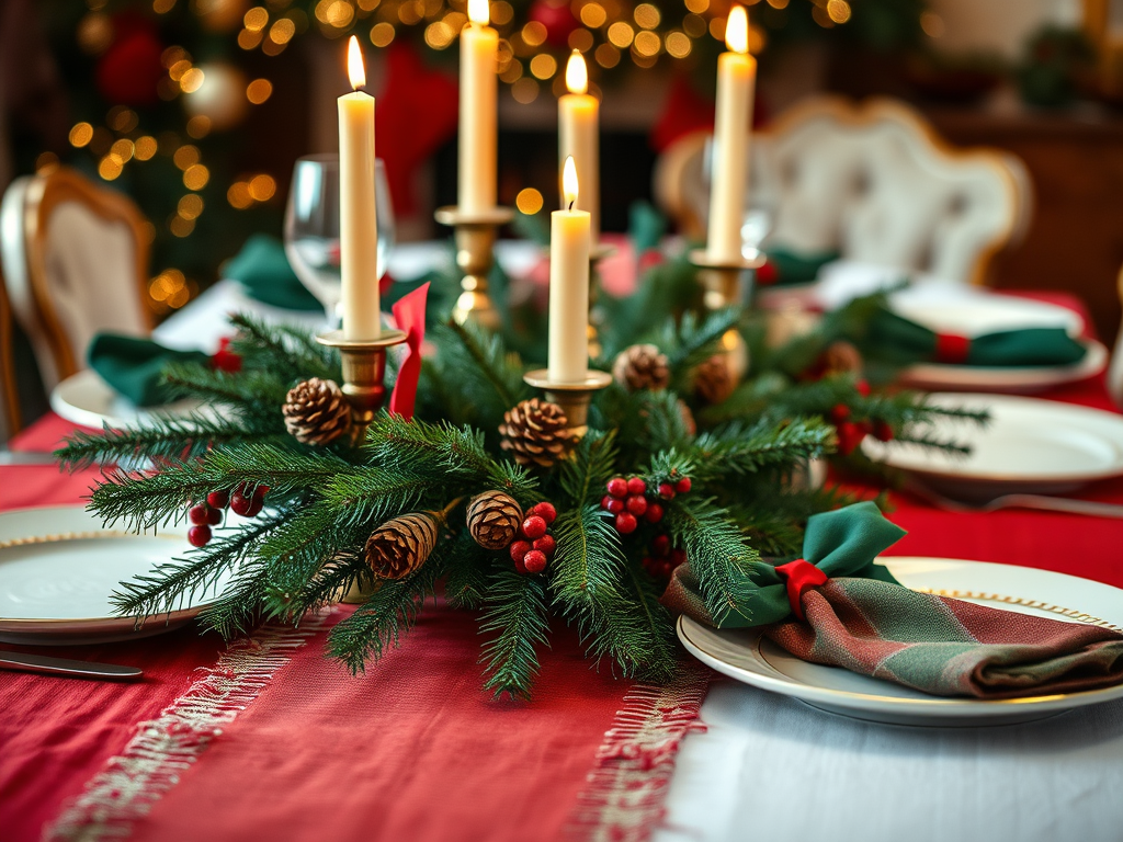 • Centre de table avec branche de sapin, bougies dorées, pommes de pin.