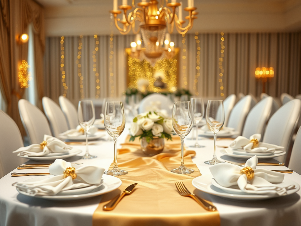 • Nappe blanche + chemin de table doré ou satiné.