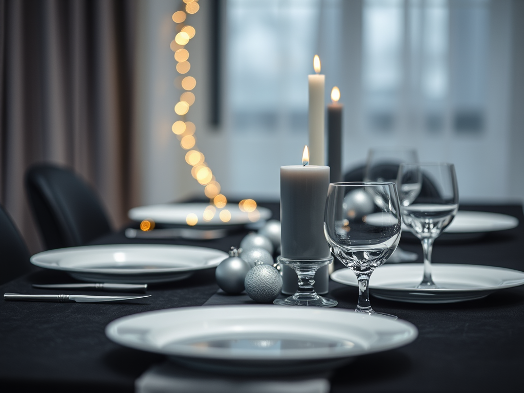 • Décor très épuré : une longue guirlande lumineuse + 2–3 boules argentées.