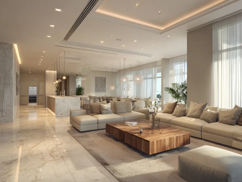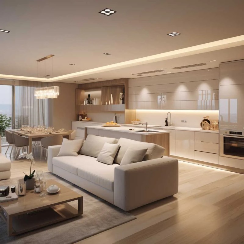Ensemble salon-cuisine élégant aux tons neutres