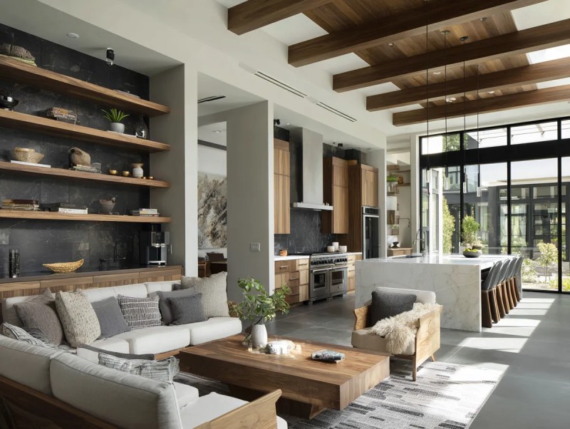 Cuisine-salon moderne avec étagères ouvertes
