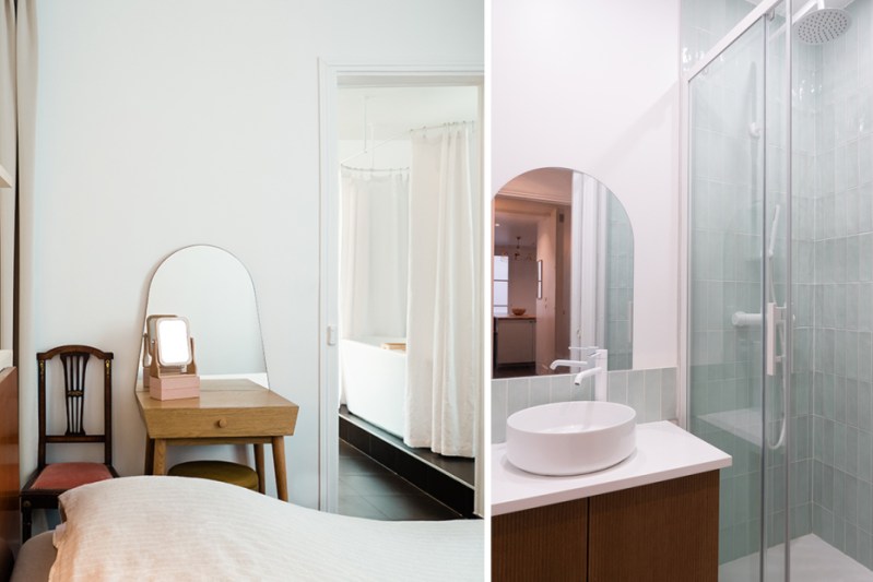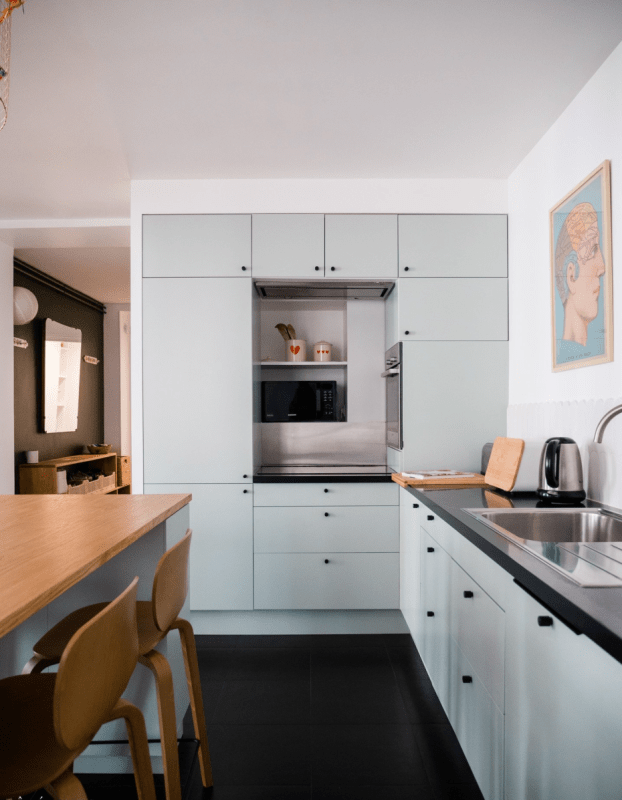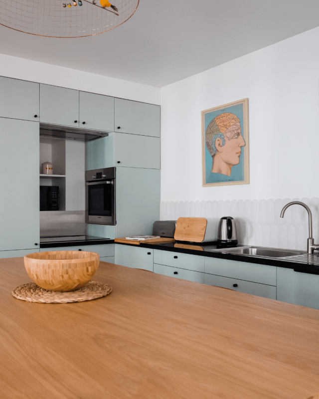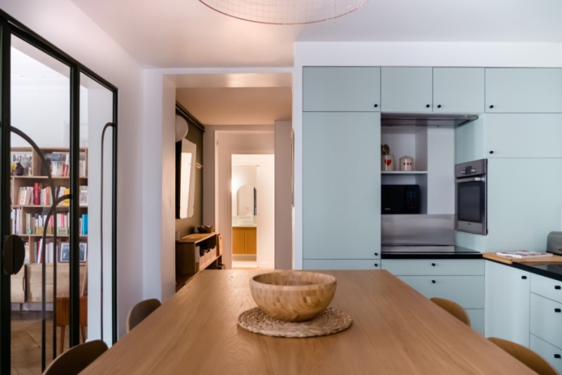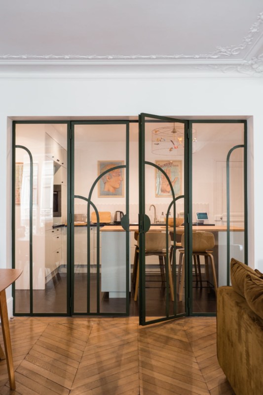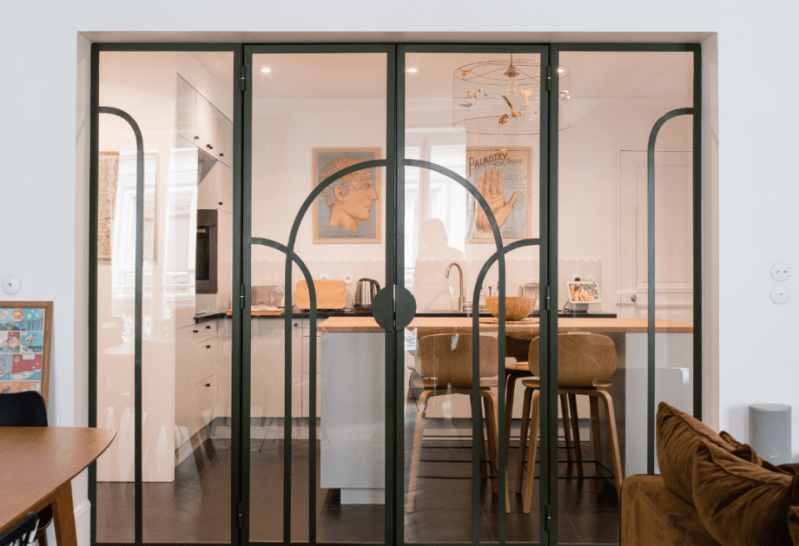 cloison vitrée aux cadres vert métallisé et aux lignes courbes, conçue sur mesure pour relier la cuisine et le salon tout en laissant entrer abondamment la lumière naturelle. Cet élément est devenu le point focal de cet appartement.