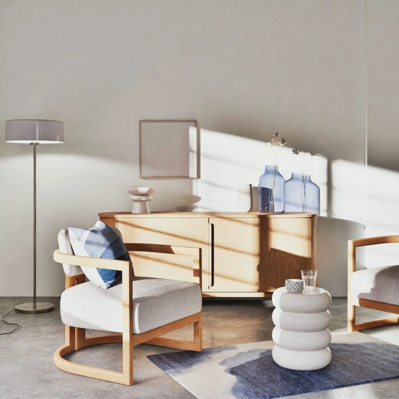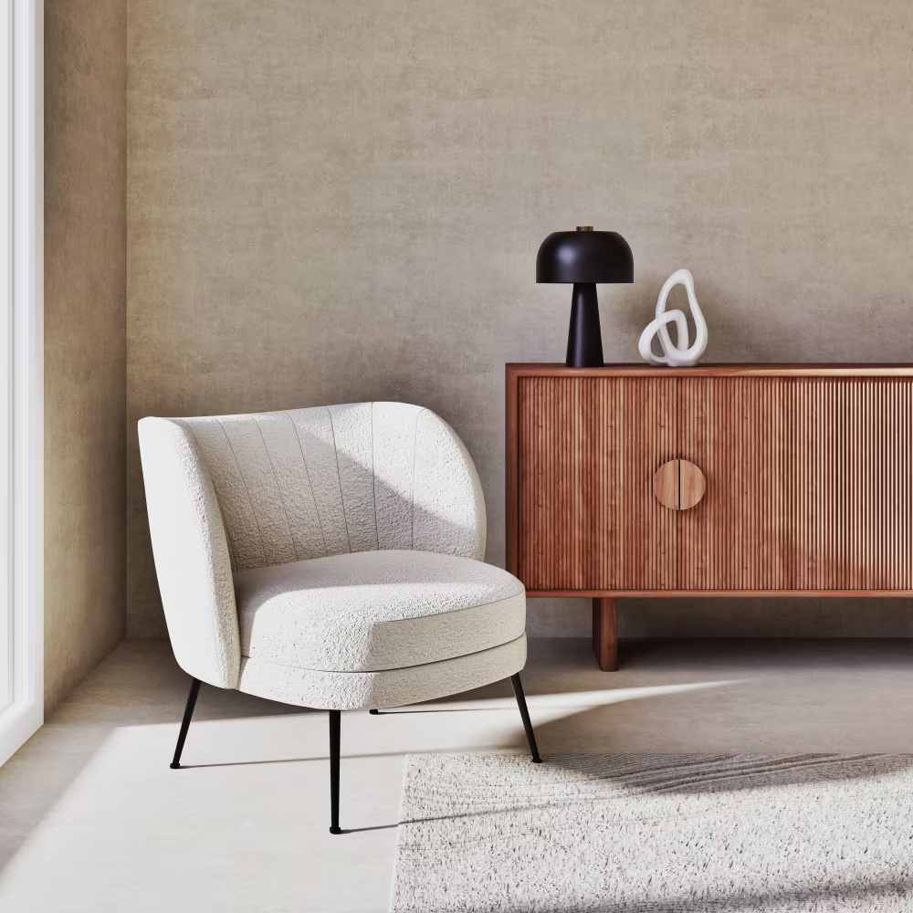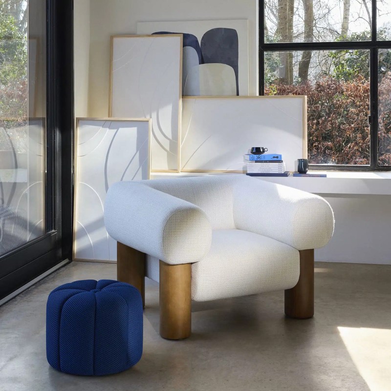Tripode Un fauteuil enveloppant, recouvert de tissu bouclé blanc, idéal pour créer un coin lecture cocooning.