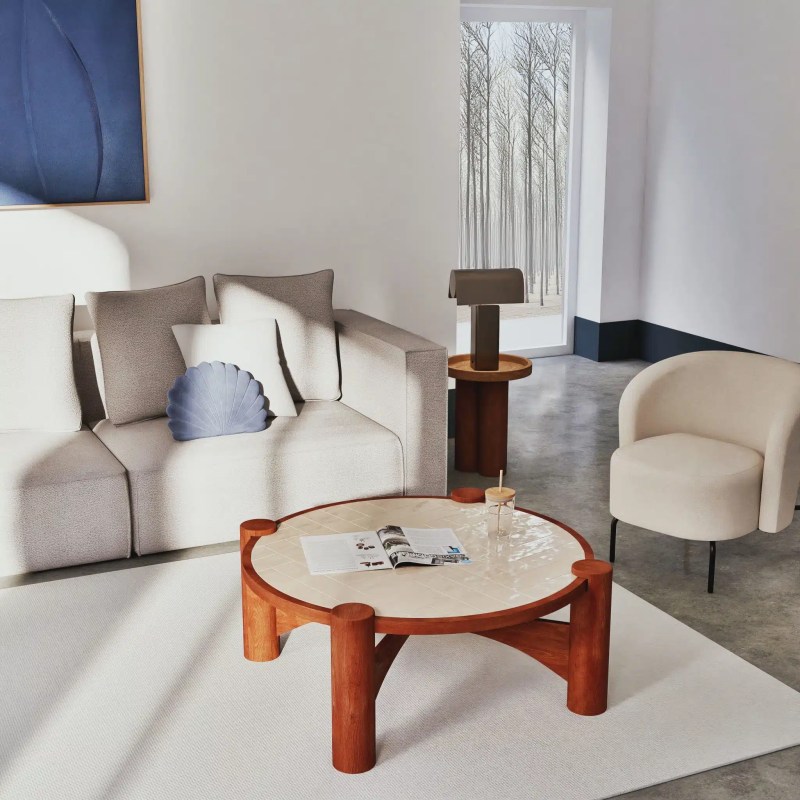 Sienna Cette Table en bois foncé et en zellij apporte du caractère. On aime sa forme ronde toute en douceur ainsi que le contraste élégant du carrelage et du blanc. Une valeur sûre.