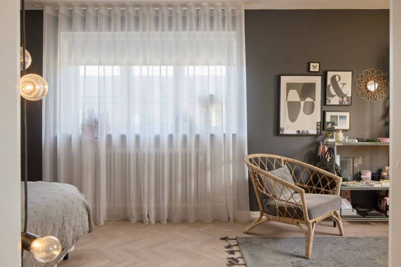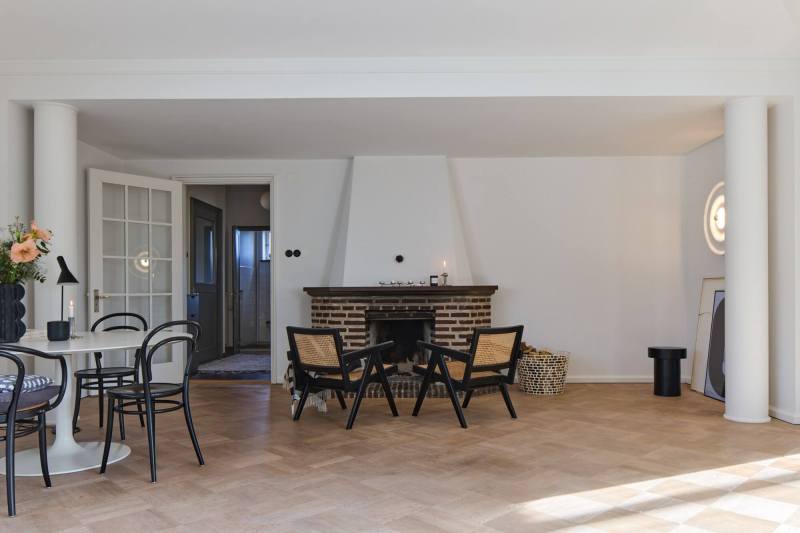 Dans des pièces volumineuses, baignées de lumière grâce à de larges baies vitrées et voilages du sol au plafond, l’ameublement est raffiné et met en valeur les formes, l’espace et le toucher. Un plafond voûté et une cheminée en briques confèrent au salon une dimension supplémentaire. L’ensemble est sobre et élégant. L’atmosphère, les détails et l’architecture s’harmonisent parfaitement. La cuisine en chêne fumé a été conçue et réalisée par Artilleriet/Tre Sekel. Le plan de travail en pierre calcaire grise du Jura habille également le généreux îlot central.