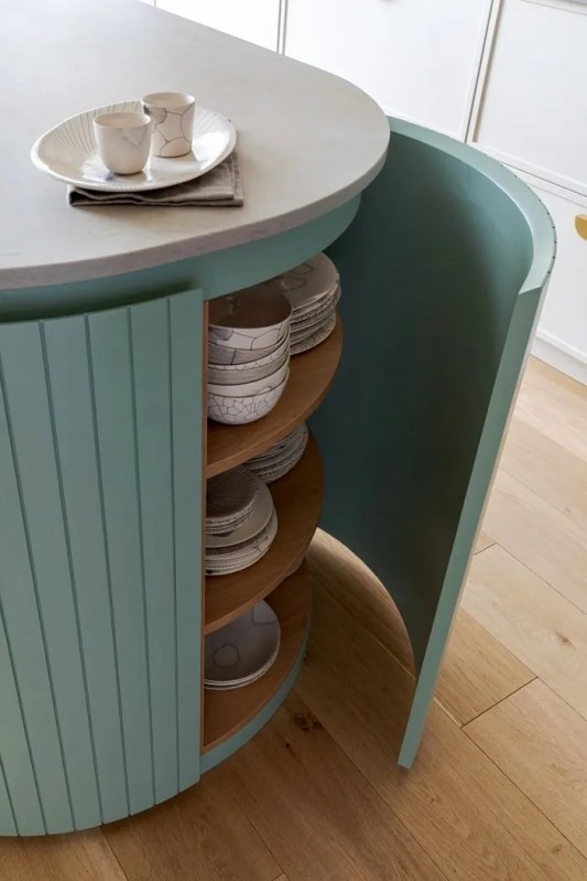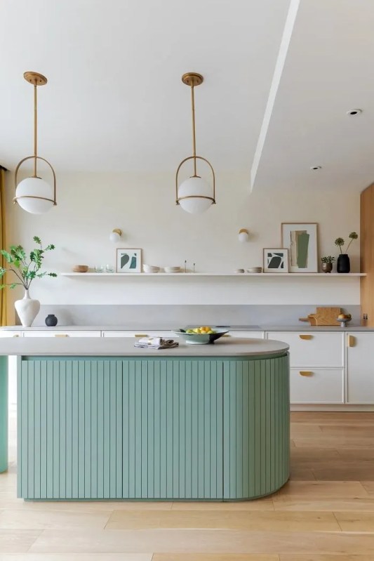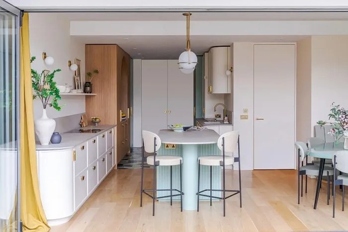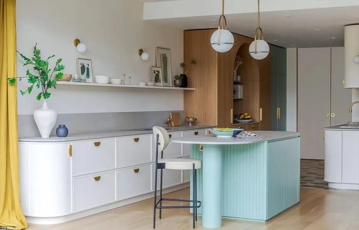 La designer Kasia Piorko a imaginé une cuisine Art Déco moderne et familiale ordonnée, agréable, où chaque fonction trouve naturellement sa place. Les rangements invisibles intégrés dans l’îlot et les colonnes centrales libèrent l’espace visuel efficacement. Ce meuble central présente une belle personnalité grâce à ses courbes douces et sa teinte bleu clair.