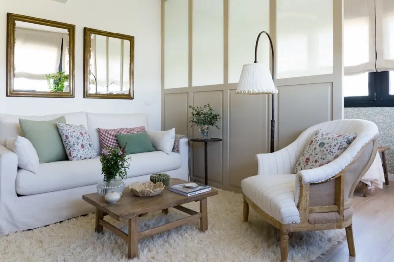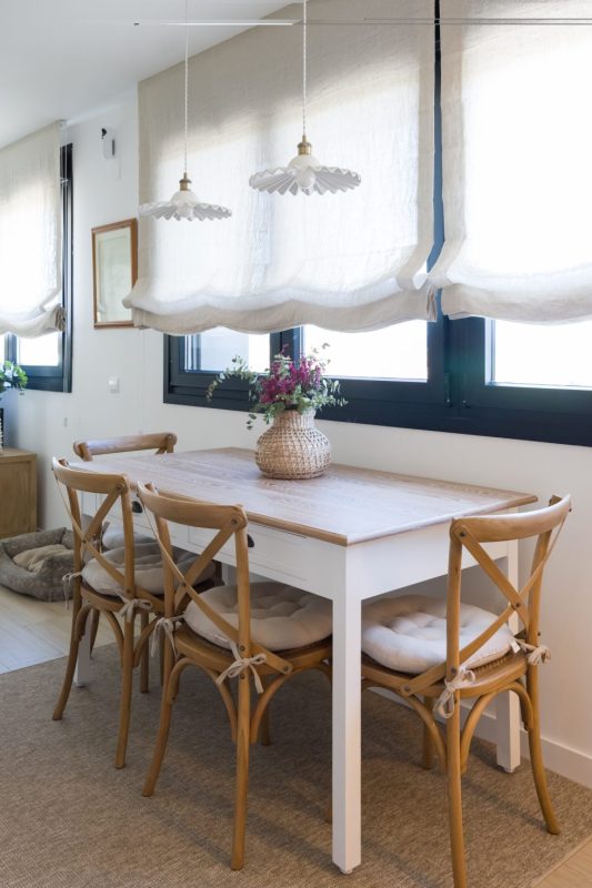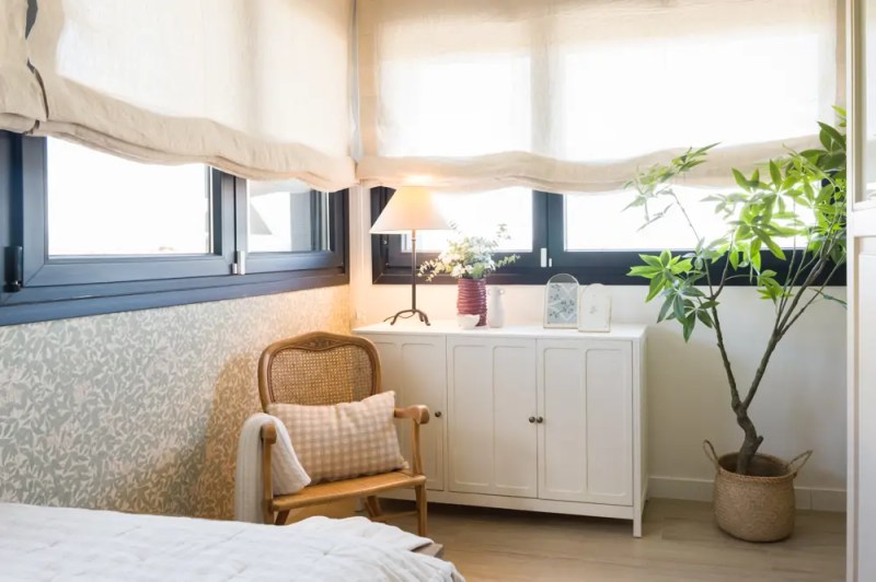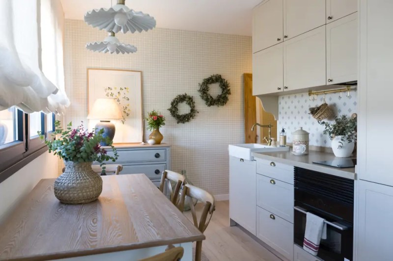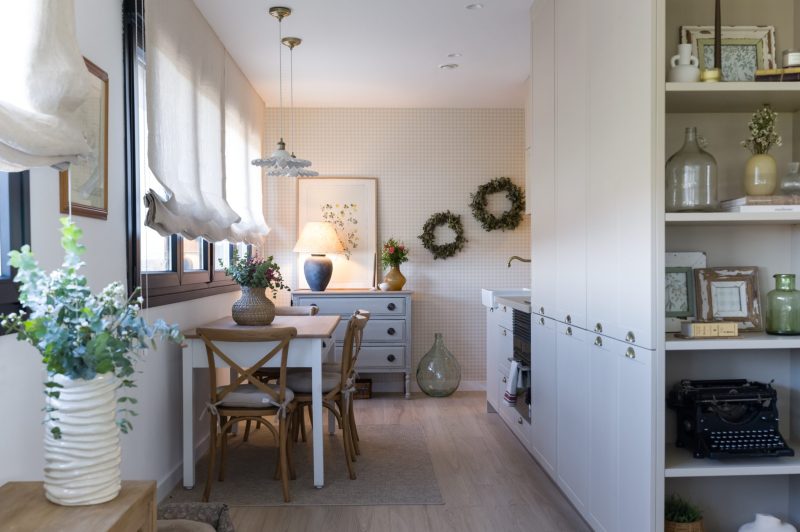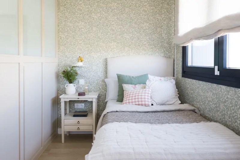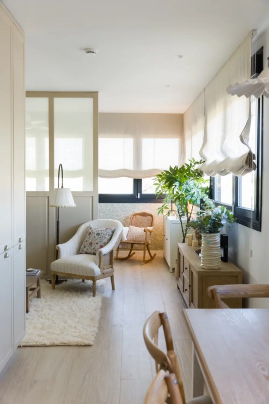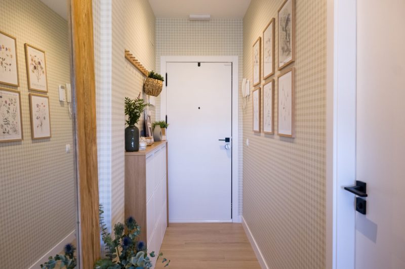 L’architecte d’intérieur Estela López,  Deco & Living, a su transformer un ancien bureau en un véritable lieu de vie avec beaucoup de soin et d’attention. Chaque mètre carré a été repensé avec amour pour créer un appartement de 35m2 à la fois agréable, fonctionnel et harmonieusement organisé. Ce défi relevait presque du casse-tête architectural, mais son objectif était guidé par une volonté de maximiser le potentiel de chaque recoin, d’organiser l’espace de manière réfléchie et de renforcer le confort au quotidien. Dès l’entrée, un petit hall fonctionnel offre une transition douce entre l’extérieur et l’intérieur, accueillant chaleureusement ceux qui passent le seuil. Le papier peint à motif vichy ajoute une touche de texture et de chaleur. Un meuble à chaussures étroit optimise le rangement tout en préservant la circulation fluide. Les affiches botaniques apportent douceur et charme, préparant le visiteur à entrer dans un intérieur véritablement accueillant.