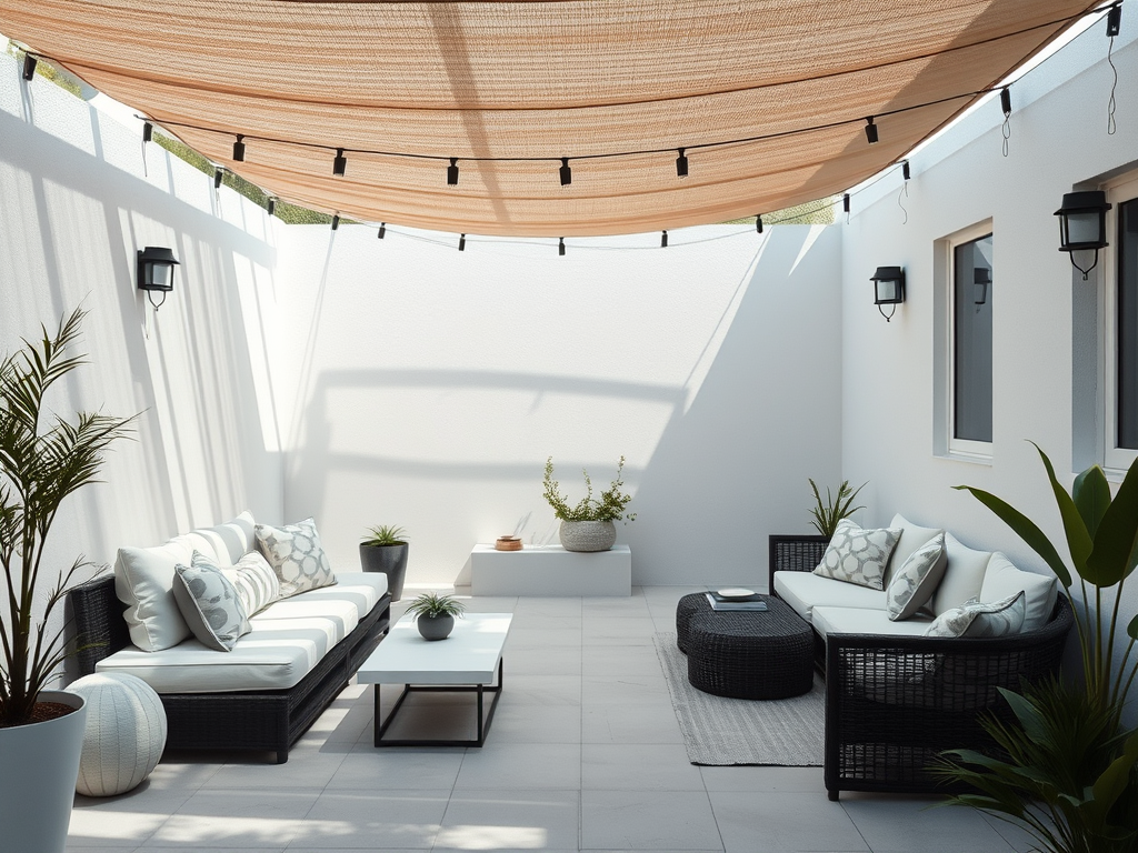 Un patio est un lieu privé et sera donc souvent ombragé. Pour que la terrasse ne paraisse pas trop sombre, choisissez des couleurs claires. Ne bourrez pas la terrasse d’accessoires, mais trouvez de la variété en utilisant différents matériaux et textures dans la même couleur claire. Ou combiner le blanc et le gris avec une autre couleur, comme le noir.