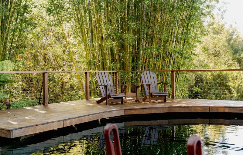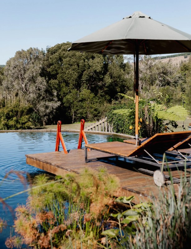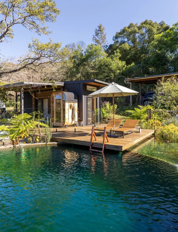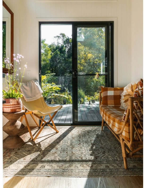 Le salon douillet, où des portes coulissantes en verre s’ouvrent sur la terrasse et les jardins extérieurs, ressemble à une autre « pièce » en soi. Il y a même un sauna et une structure en forme de A récupérée que Sophie a transformée en chambre supplémentaire.