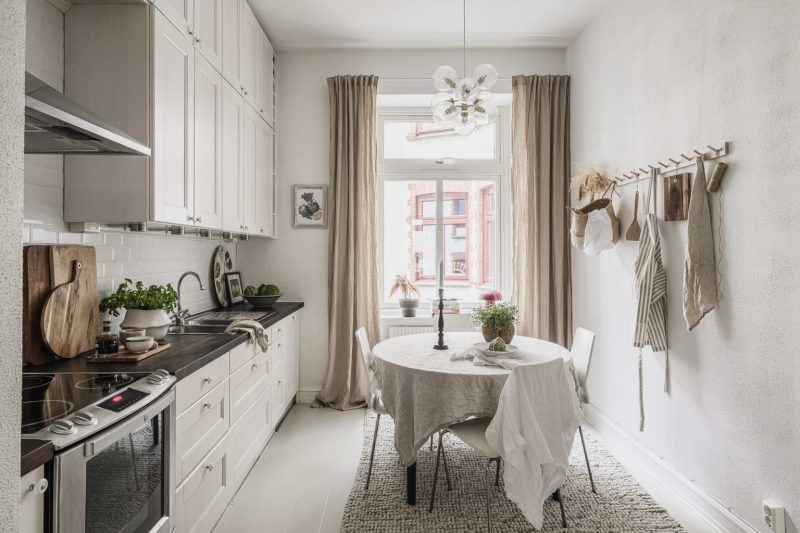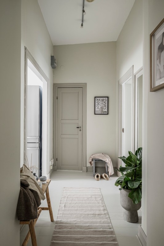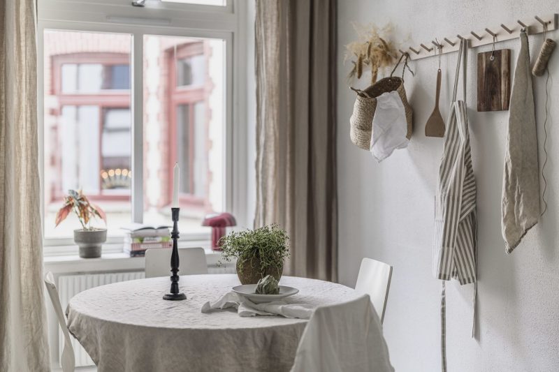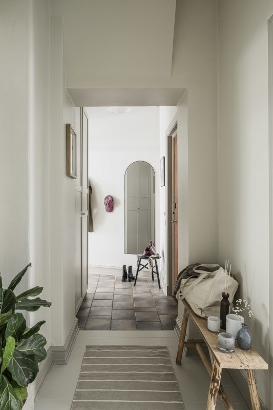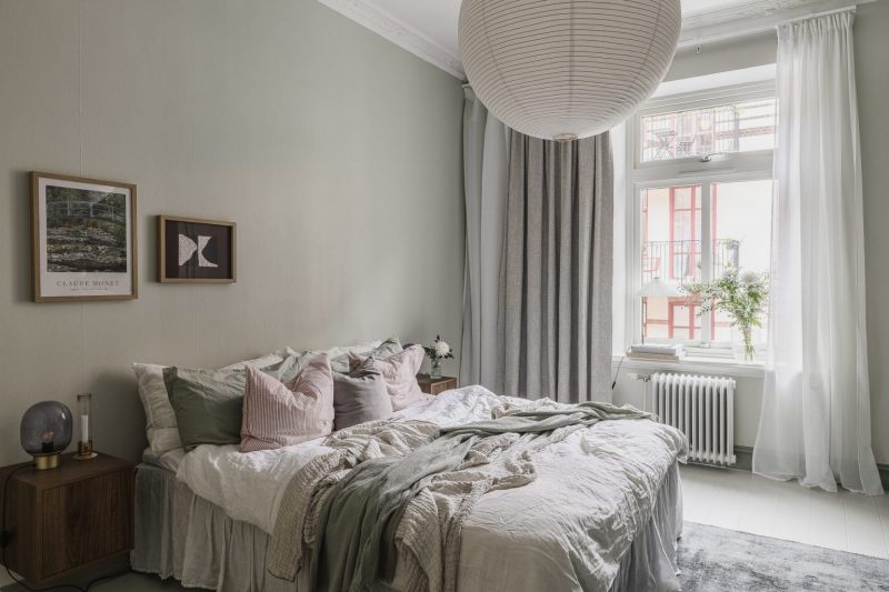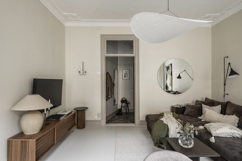 Le salon est décoré dans un style contemporain scandinave, sobre mais jamais froid, grâce à ses douces nuances neutres. La chambre principale poursuit cette ambiance feutrée et douillette avec ses rangements intégrés, ses moulures conservées et son sol peint La grande cuisine, de style classique, associe mobilier clair et plan de travail en bois foncé.