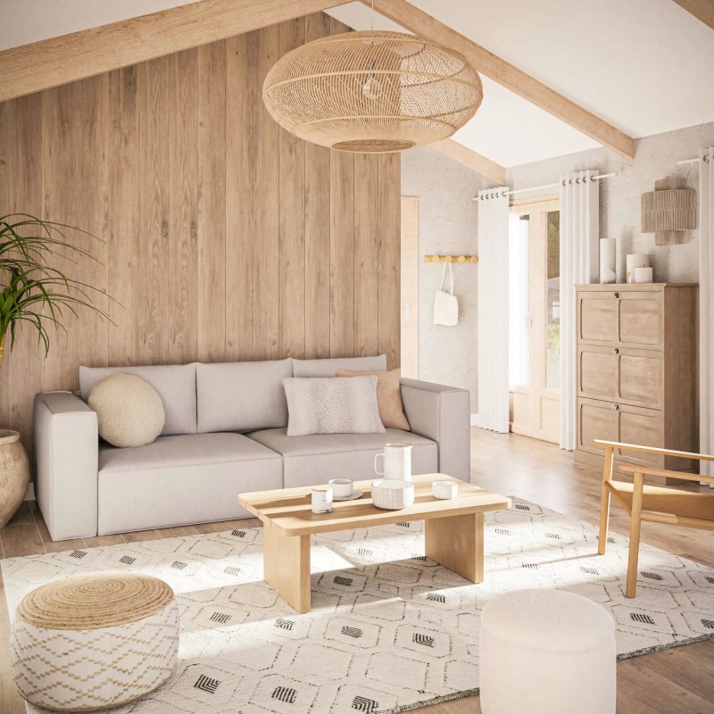 - Matières : rotin, coton lavé, céramique, bois clair