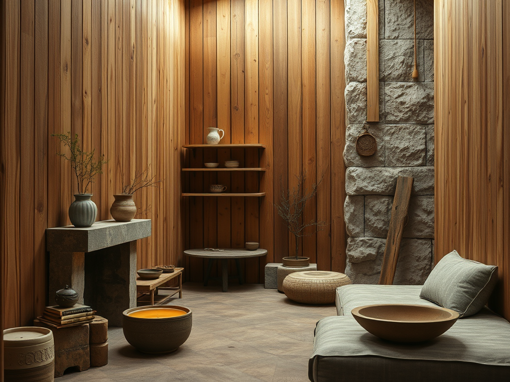 Bois visible, fibres naturelles, céramique artisanale, pierres texturées — la texture est reine. L’intérieur devient tactile et apaisant, loin des surfaces lisses et froides.