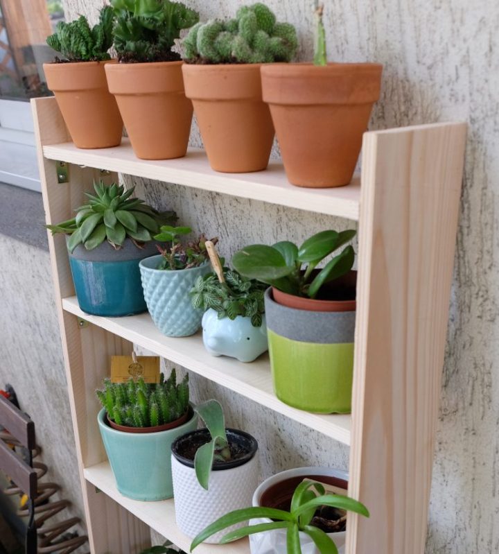 ÉTAGÈRE À PLANTES : fabriquez votre propre étagère pour ranger vos herbes aromatiques et fleurs préférées. Vous ne savez pas où placer les plantes que vous souhaitez rentrer à l’intérieur pendant l’hiver ? Nous avons une idée pour fabriquer un support pratique et esthétique que vous pourrez facilement utiliser sur votre terrasse ou votre balcon pendant l’été.