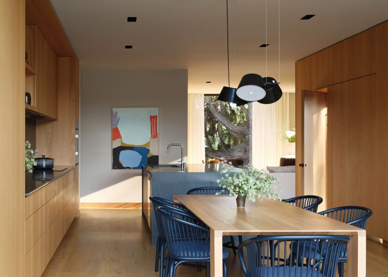 La cuisine ouverte et la salle à manger forment le cœur de la maison.Orienté vers le jardin intérieur, il constitue un point de convergence central qui relie visuellement et physiquement les deux bâtiments du terrain.