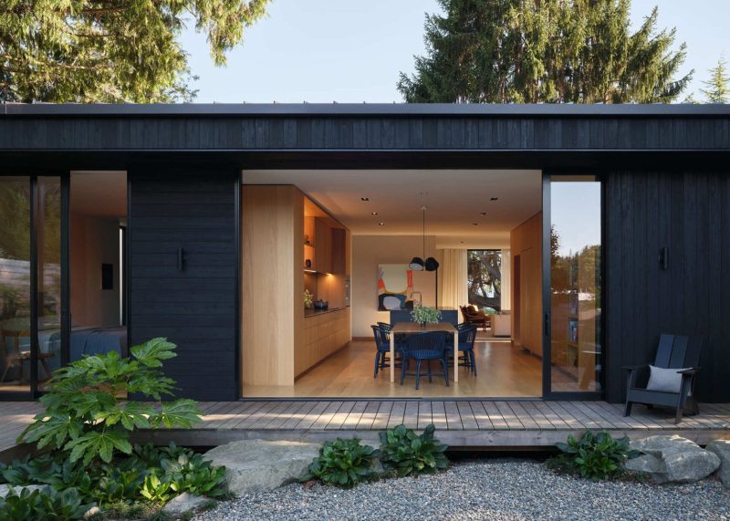 La lumière naturelle, les vues sur l’extérieur et l’accès direct au jardin renforcent l’idée que la maison fonctionne comme une succession d’espaces connectés plutôt que comme un seul volume clos