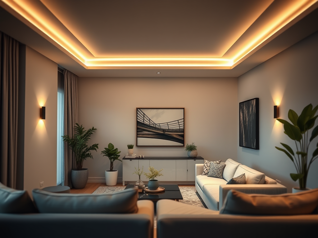 L’éclairage d’accentuation crée une atmosphère et met en scène les meubles, les plantes ou les tableaux. L’éclairage indirect dans le salon est souvent produit par des rubans LED placés derrière les meubles ou au plafond derrière des profilés. Les appliques murales avec des cônes de lumière modelés constituent également une décoration d’ambiance pour le salon. Un éclairage indirect est particulièrement agréable et crée de la profondeur dans la pièce.