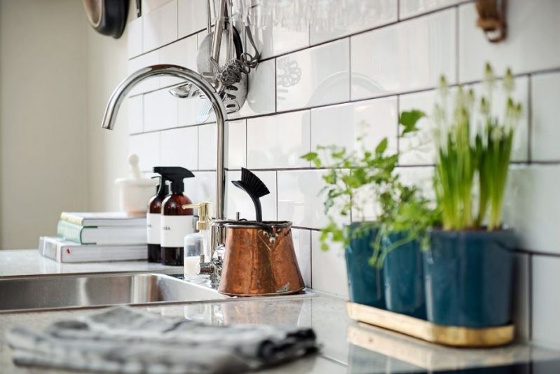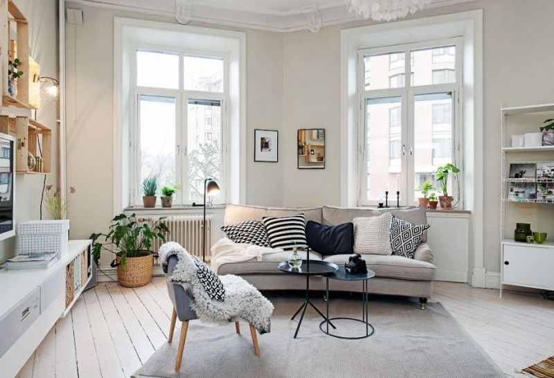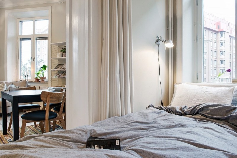 Les hauts plafonds de cet ancien appartement de deux pièces dans le centre de Göteborg, ainsi que les grandes fenêtres aux dimensions atypiques laissant entrer une abondante lumière naturelle, et la couleur blanche prédominante du mobilier ainsi que des revêtements de sol et muraux, donnaient à cet intérieur une impression d’espace bien supérieure à sa taille réelle.