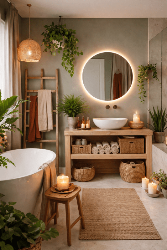 - Accessoires : paniers en fibres naturelles, serviettes unies