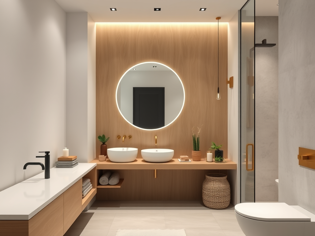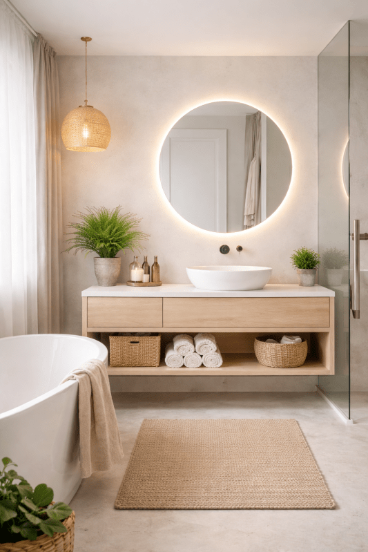 - Matériaux : bois clair, pierre naturelle, béton ciré