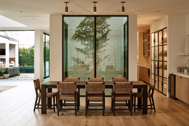 La maison se divise en deux ailes : l’une abrite les pièces à vivre principales, l’autre une salle de cinéma, un bureau et une salle de sport. Dès l’entrée, la hauteur sous plafond impressionnante accueille les visiteurs, tandis que les tons de chêne qui habillent toutes les surfaces horizontales préservent l’harmonie des proportions. Il en résulte une maison qui paraît plus petite qu’elle ne l’est réellement, ce qui, pour une demeure conçue pour être intime plutôt qu’impressionnante, est un véritable tour de force.