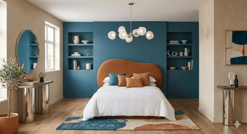 Végétation : Le vert profond des plantes (type Monstera) se marie divinement bien avec le Bleu Orage et l’Ambre.
