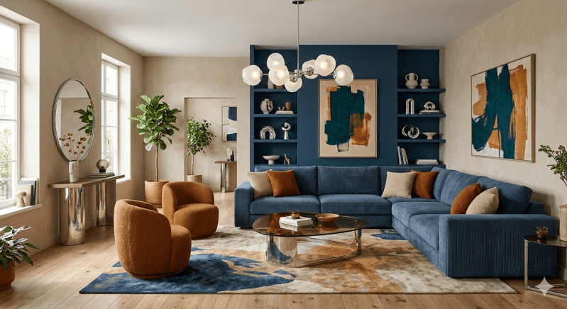 la chaleur des éléments d’inspiration mid-century (comme les fauteuils bouclés ocre et le bois foncé) avec la fraîcheur et la sophistication du bleu profond et des accents chromés. Le résultat est un espace équilibré, plein de texture et de caractère, qui ne laisse effectivement pas indifférent.