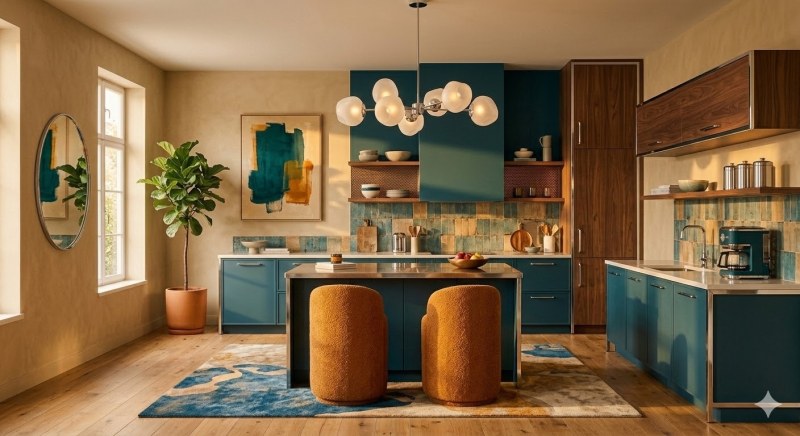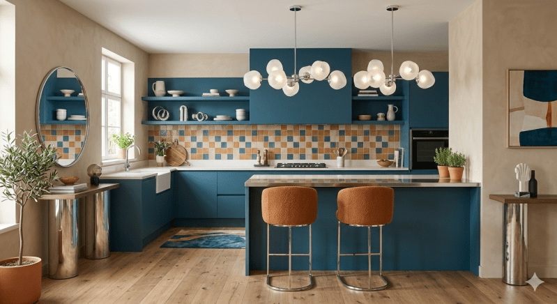 On y retrouve des éléments clés de la tendance « Nostalgie Moderne » : les façades de placards en bleu profond et les plans de travail en bois foncé apportent du caractère et de la chaleur, s’éloignant du minimalisme froid. L’utilisation du laiton et des verres texturés rappelle le milieu du siècle, tandis que l’îlot central aux formes organiques et l’éclairage suspendu ajoutent une touche résolument 2026.