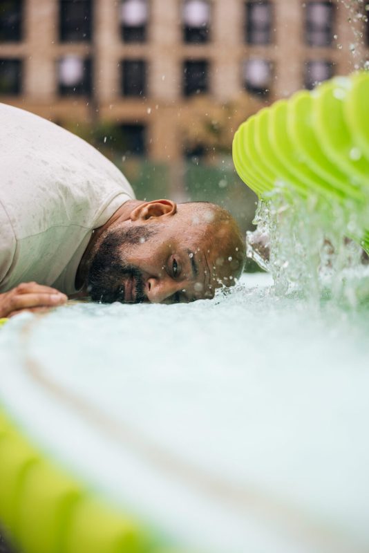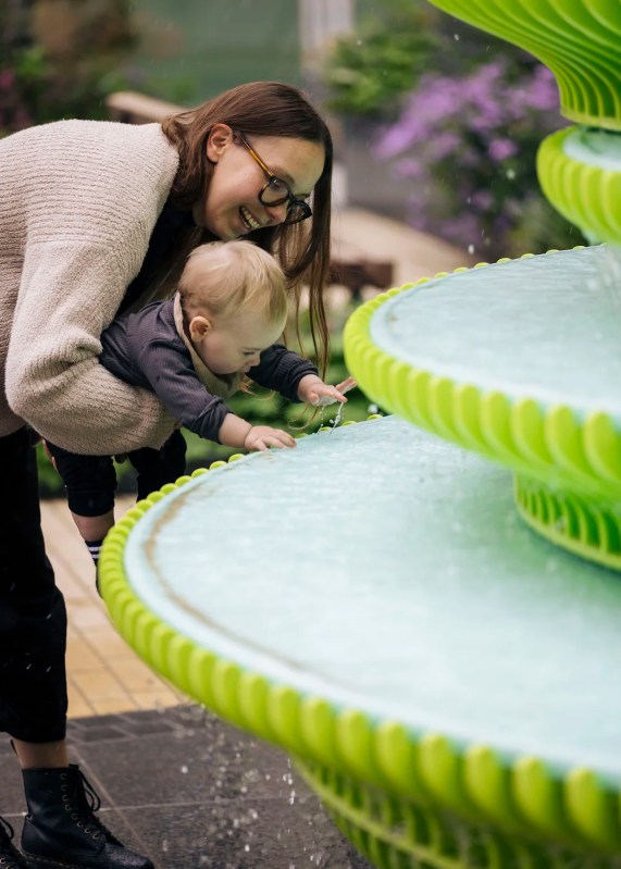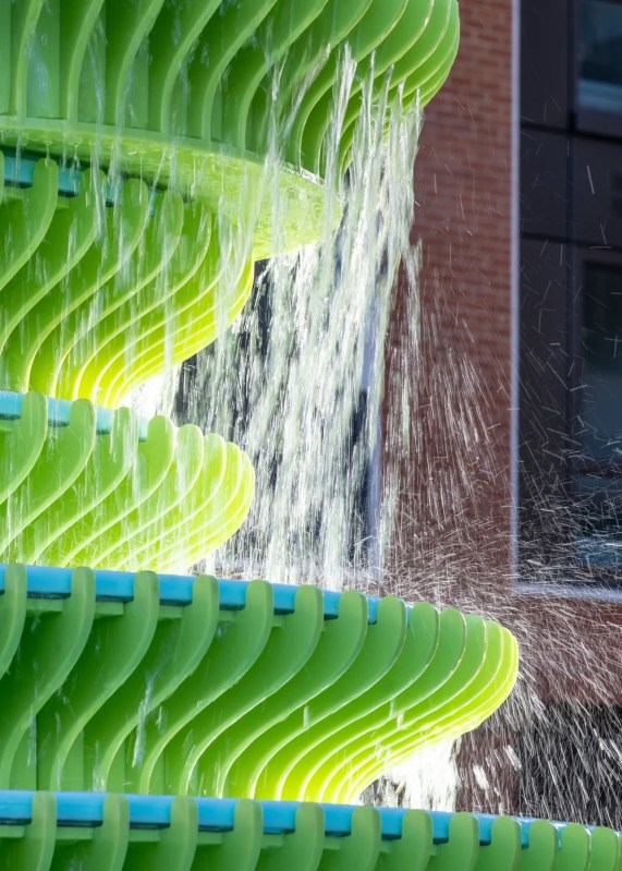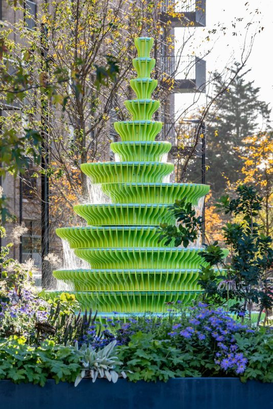 Située en plein cœur de la place du quartier de Brent Cross Town à Londres, la fontaine surgit du sol, point focal d’un vert éclatant qui contraste élégamment avec les bâtiments de briques rouges environnants. Telles les couches aériennes d’un gâteau impossible à réaliser, les différents niveaux de la fontaine sont décalés, permettant à l’eau de cascader sur le trottoir en contrebas. Les ailettes qui bordent les différents niveaux offrent non seulement un attrait visuel, mais créent également un effet de diffusion intéressant, ralentissant ainsi la chute inévitable de l’eau. C’est simple : nous nous rassemblons autour de l’eau. Boire, se laver, nager… l’eau a toujours été essentielle à toutes les sociétés, à chaque étape de notre histoire relativement courte sur Terre. Nous créons des liens, nous nous abreuvons et nous partageons autour de l’eau, cette force vitale dont la dualité explique une grande partie du comportement humain. Cultiver ce sentiment d’appartenance à une communauté est vital pour notre santé et notre bonheur. Pourtant, avec la raréfaction des lieux de rencontre, comment concilier travail, vie personnelle et mille autres sollicitations ? Découvrez