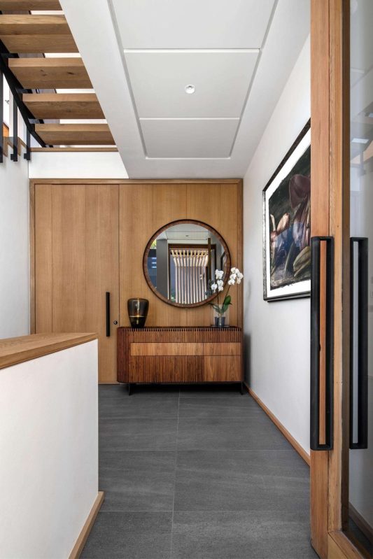 Des murs en pierre et en gabion remplis de plantes ancrent l’avant de la maison. Un éclairage extérieur met en valeur la base texturée, tandis que des lattes en bois au niveau supérieur introduisent de la chaleur.
