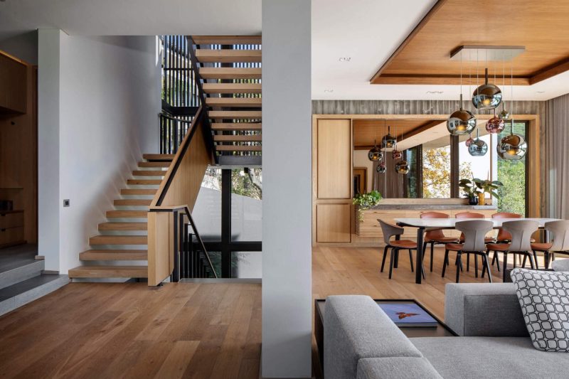 Plutôt que d’aplanir le terrain, les architectes ont conçu une maison à trois niveaux qui l’épouse, s’élevant le long de la colline et encadrant les vues sur le paysage environnant.