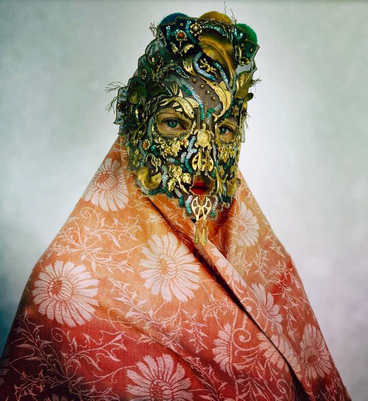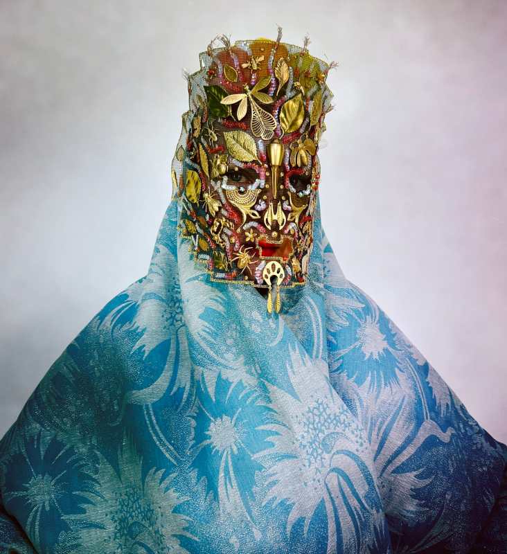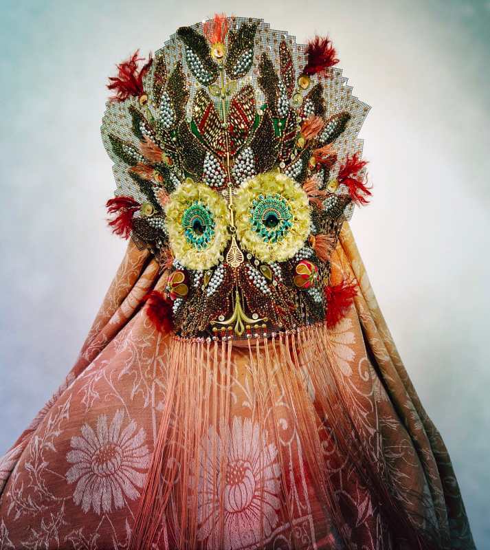 À la frontière entre mode, sculpture et performance, ses masques spectaculaires composent un univers visuel immédiatement reconnaissable — un carnaval baroque où les identités se superposent et se transforment.