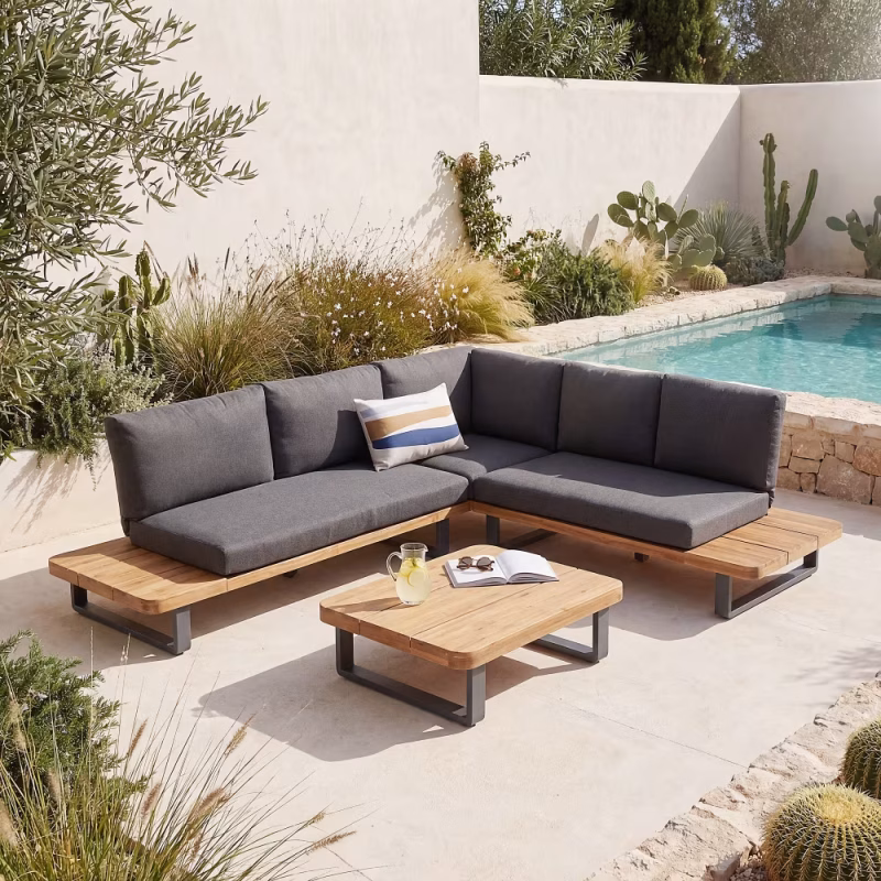 Maldives – Salon de jardin 4/5 places en aluminium anthracite, bois d’acacia et coussins en polyester recyclé anthracite Maisons du Monde