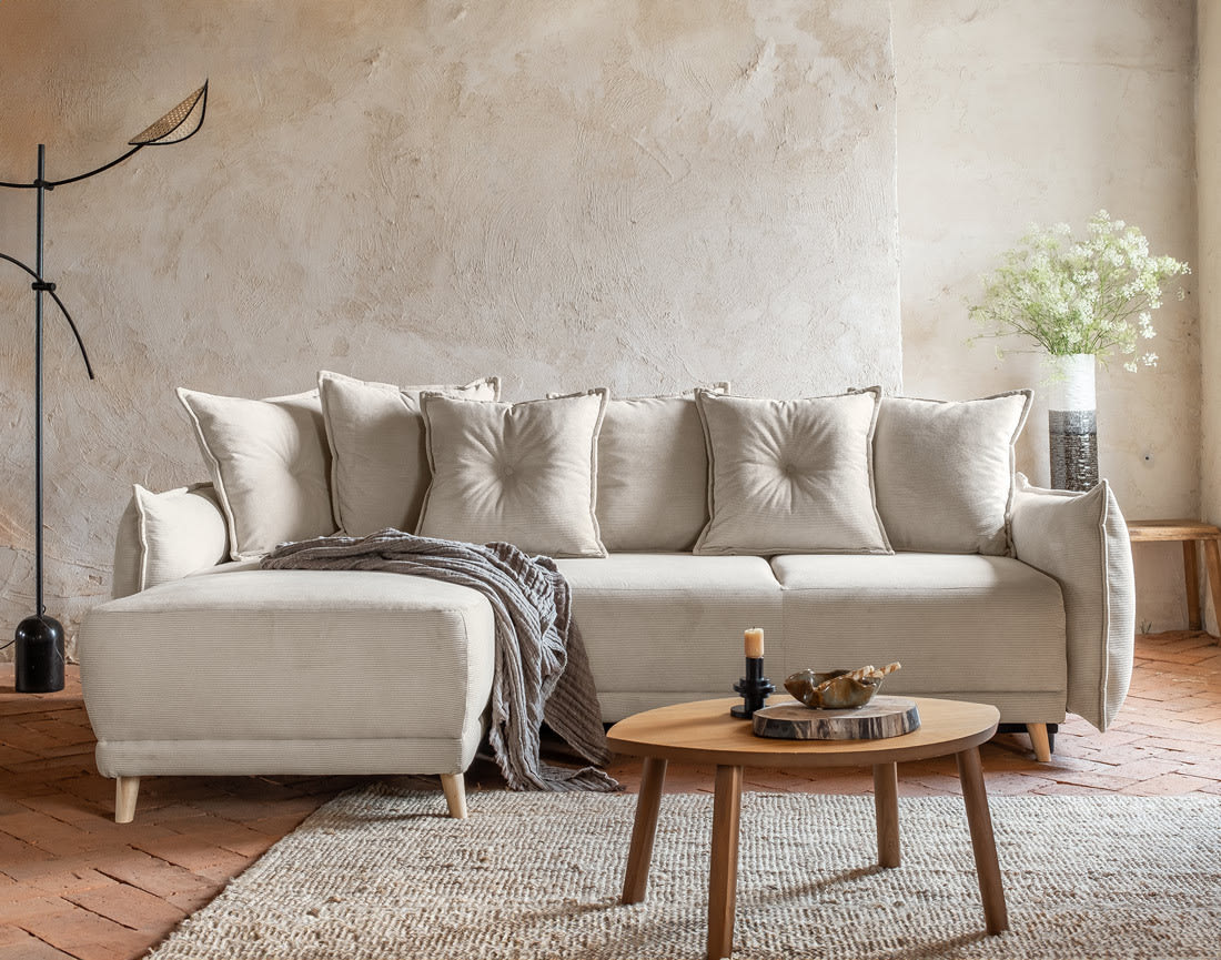 Canapé droit convertible coffre EVEREST tissu chiné avec pouf chez Bobochic 1 799 €