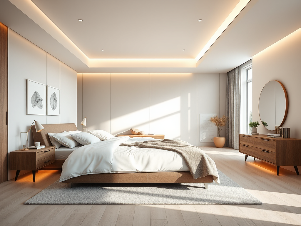 - Mobilier épuré : Choisissez des meubles aux lignes simples et fonctionnelles. Un lit bas avec une tête de lit discrète, une table de chevet compacte et une armoire sans ornements sont idéaux. Priorisez la qualité à la quantité.