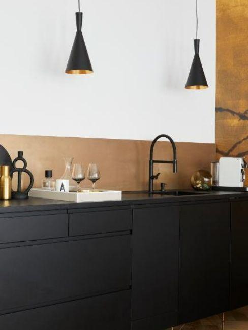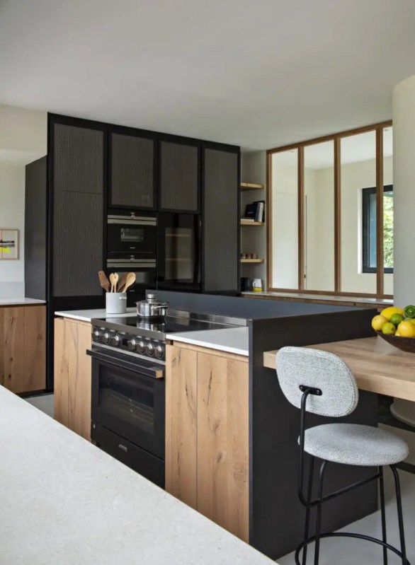 Si votre cuisine dispose d’alcôves, c’est le moment de les mettre en valeur. Pour cela, rien de mieux qu’une cuisine noire et bois pour réchauffer l’ambiance. Le sol se veut simple pour ne pas étouffer l’atmosphère. Les lignes épurées sont de mise. Et le mobilier s’habille de pin vernis et de bois noir. Le minimalisme se retrouve aussi dans les luminaires aux formes circulaires simples et avec des miroirs sans encadrement.
