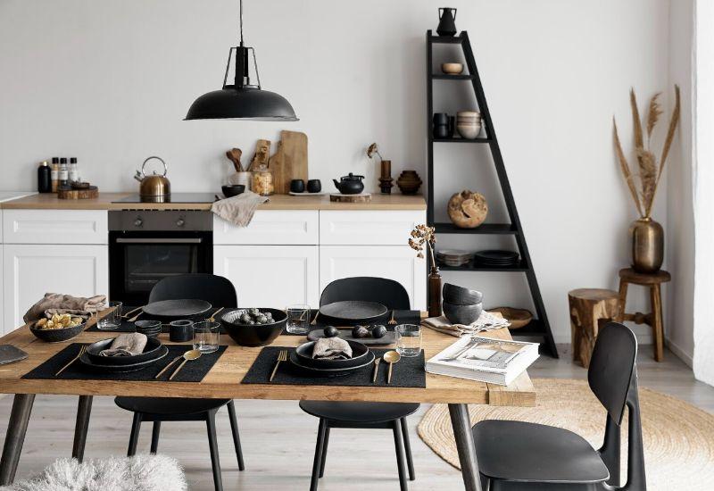 Même si le style scandi préfère le blanc, on ose l’originalité en lui apportant de belles touches de noir. Pour une cuisine conviviale, on installe une grande table en bois brut et aux pieds noirs et on dispose des chaises noires simples autour d’elle. La présence du bois permet de rester fidèle à la tendance scandinave, tout comme le tapis en jute et de grandes fleurs séchées dans un pot cuivré.
