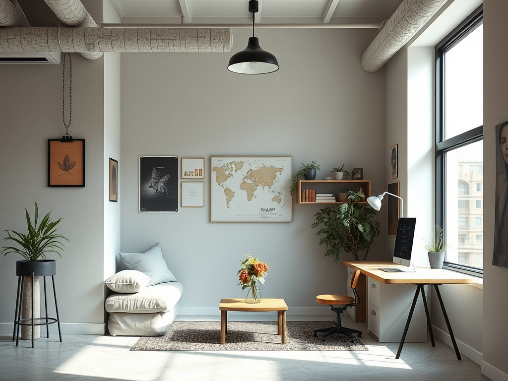 - Décor : Miroir rond en rotin, plante pothos, affiche minimaliste.
